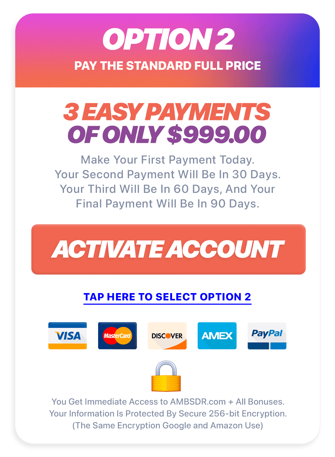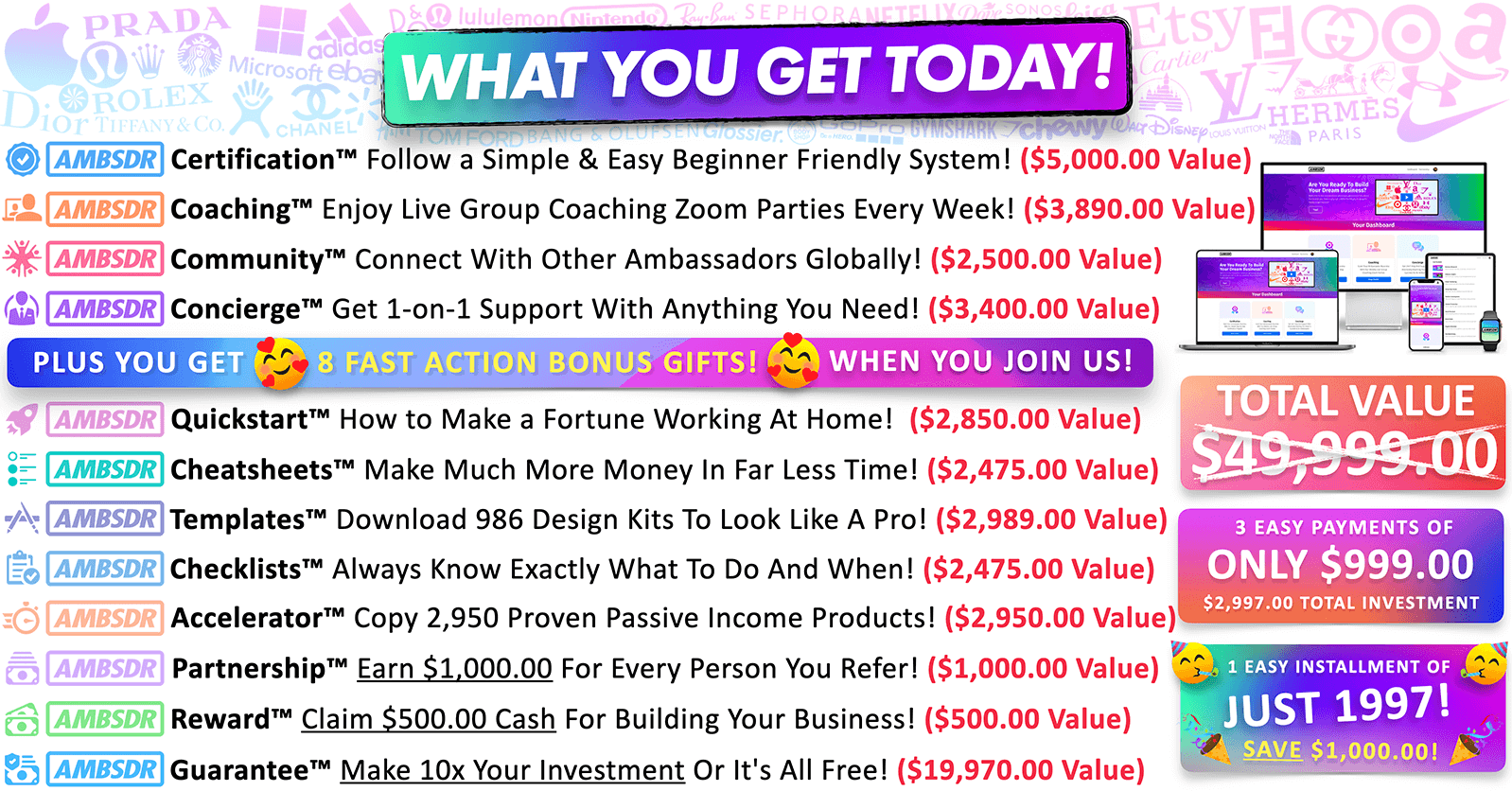 For us to fill the demand, we're doing a TINY EXPERIMENT TODAY where you can join us inside AMBSDR.com and get Certified for as low as $999 today (and then it's just 2 more monthly payments of $999 equally spaced apart over the next 30 days). Â